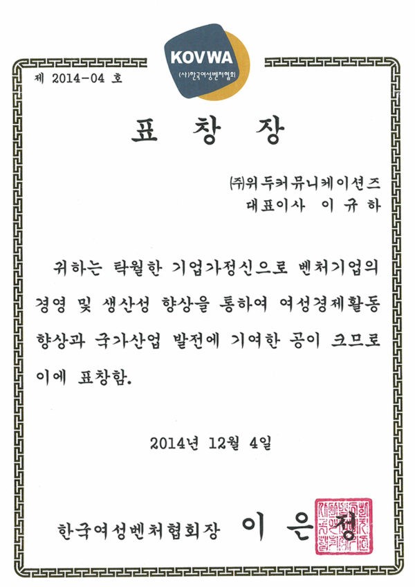 한국여성벤처협회 표창장