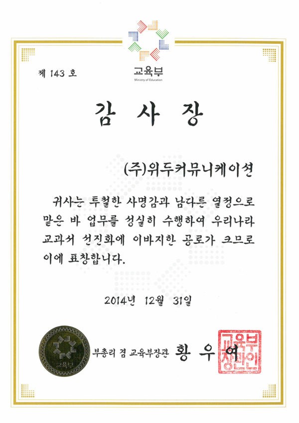 감사장 제 143호 페이지 정보 작성자 WeDu 댓글 0건 조회 6,378회 작성일 19-05-30 19:33 본문 2014-12-31 감사장 제 143호 교과서 선진화 부총리 겸 교육부장관 황우여 List Previous산업통상자원부 표창장 19.05.30 Next한국여성벤처협회 표창장 19.05.30