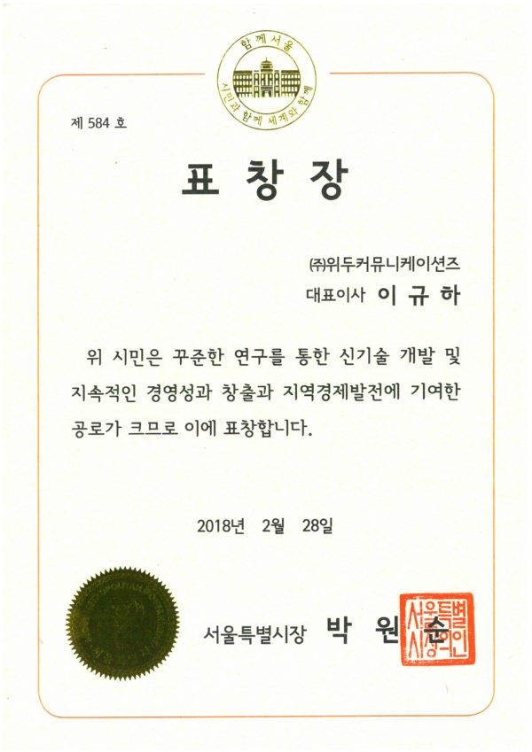 서울특별시장 표창장 페이지 정보 작성자 WeDu 댓글 0건 조회 7,097회 작성일 19-05-30 19:35 본문 2018-02-28 표창장 제 584호 신기술 개발 및 지속적인 경영성 창출, 지역 경제 발전 기여 서울특별시장 박원순 List Previous2018 소년한국 우수 어린이 도서 19.05.30 Next서울클러스터 어워드 우수상 19.05.30