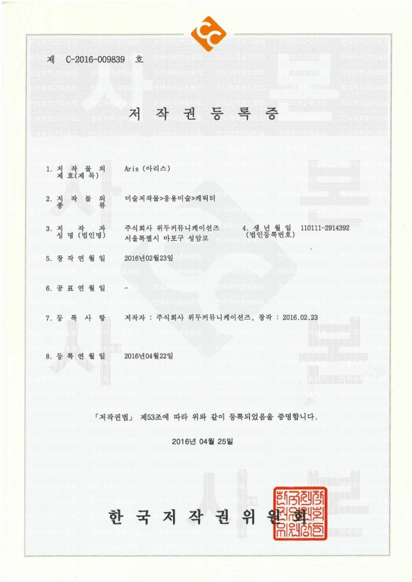 [한국/저작권] 아리스 페이지 정보 작성자 WeDu 댓글 0건 조회 6,618회 작성일 19-05-30 19:09 본문 2016-04-22 저작권 C-2016-009839 아리스 / 미술저작물>응용미술>캐릭터 List Previous[한국/저작권] 필립 19.05.30 Next[한국/저작권] 리안 19.05.30